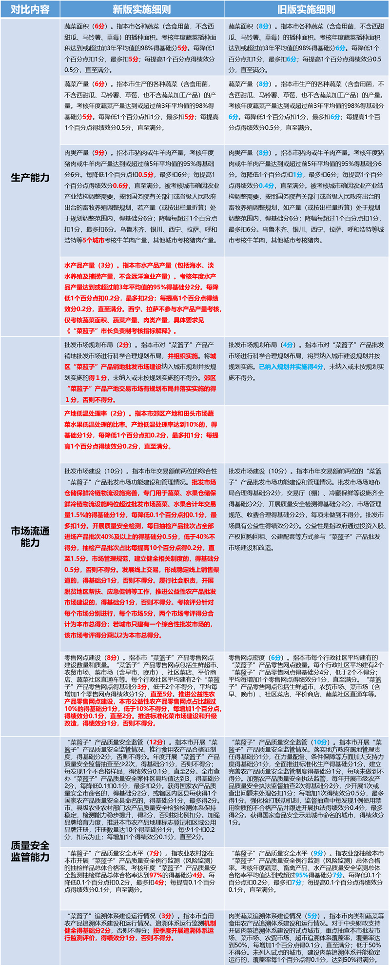 2017年2月,原农业部会同“菜篮子”食品管理部际联席会议其他成员单位制定的《“菜篮子”市长负责制考核办法实施细则》印发。记者对比发现,此次修订的新版实施细则在分值方面做出多处调整,蔬菜面积、蔬菜产量、肉类产量等分值有所变动,另外新增了水产品产量,计3分。