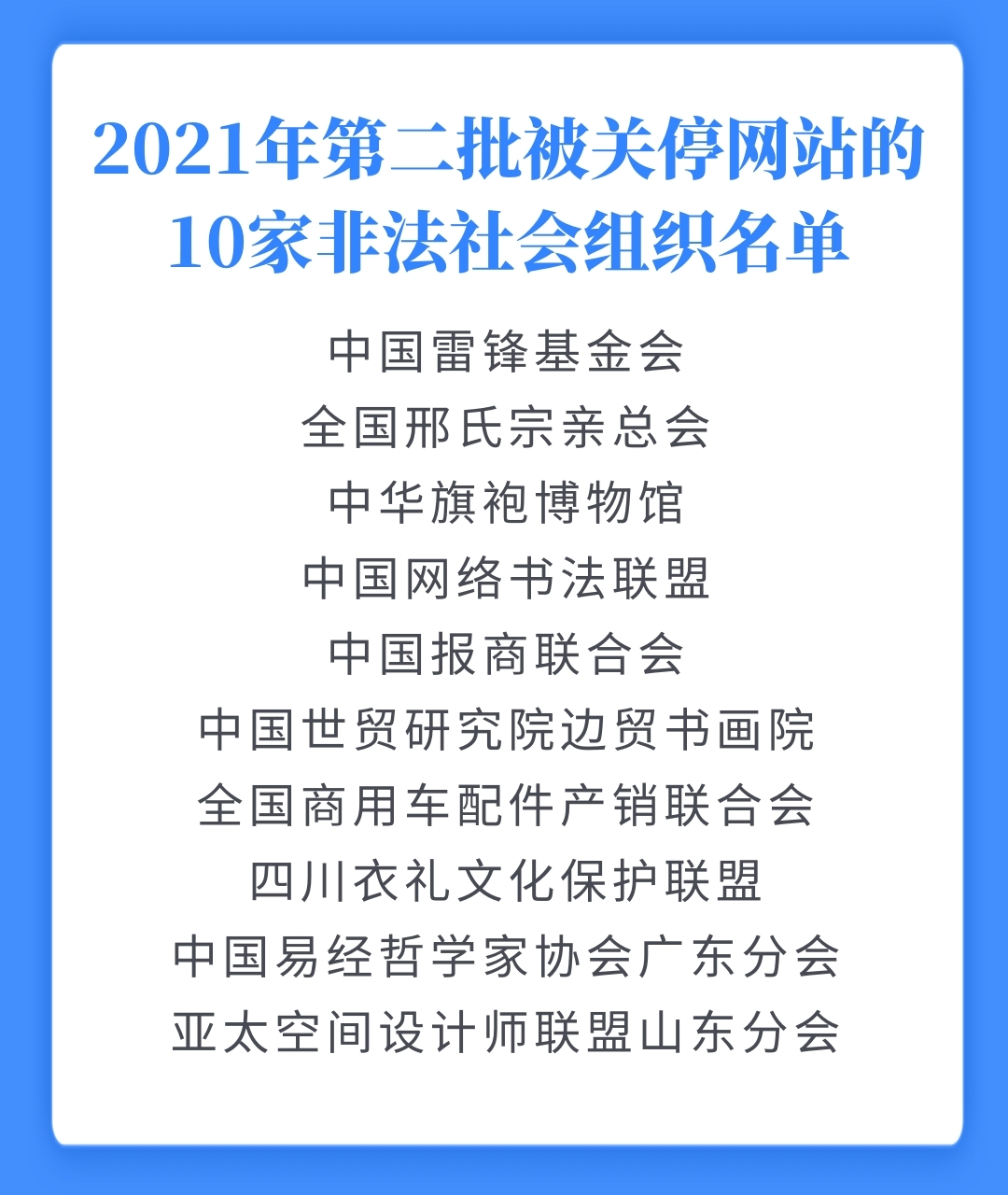 此次的关停涉及中国雷锋基金会、全国邢氏宗亲总会、中华旗袍博物馆、中国网络书法联盟、中国报商联合会等10家已被取缔的非法社会组织。具体包括:
