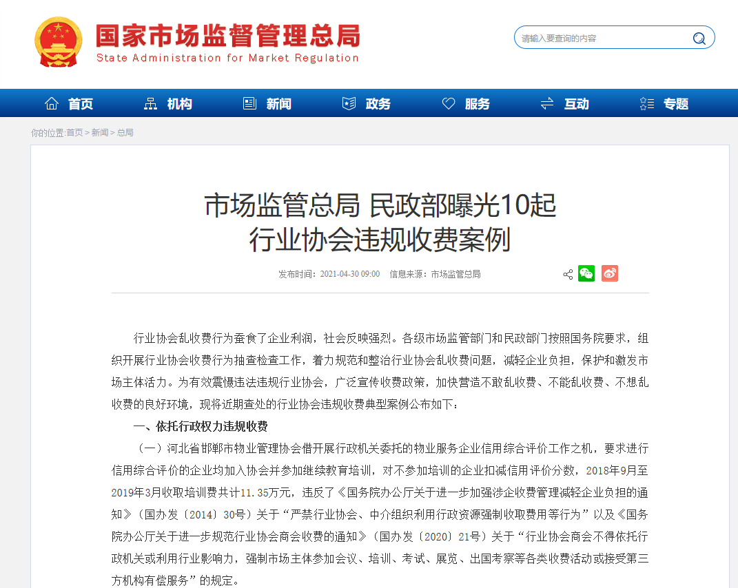 市场监管总局、民政部曝光10起行业协会违规收费案例。图片来源:市场监管总局官网