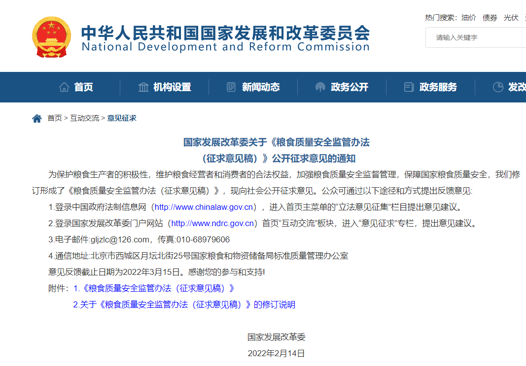 人民网北京2月14日电 (申佳平)据国家发展改革委官网消息,为保护粮食生产者的积极性,维护粮食经营者和消费者的合法权益,加强粮食质量安全监督管理,保障国家粮食质量安全,国家发展改革委修订形成了《粮食质量安全监管办法(征求意见稿)》(以下简称《征求意见稿》),其中要求实行粮食销售出库质量安全检验制度。