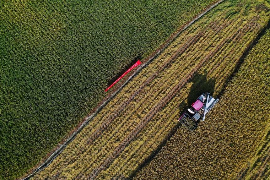 收割机在重庆市黔江区小南海镇大路社区收割稻谷。杨敏摄