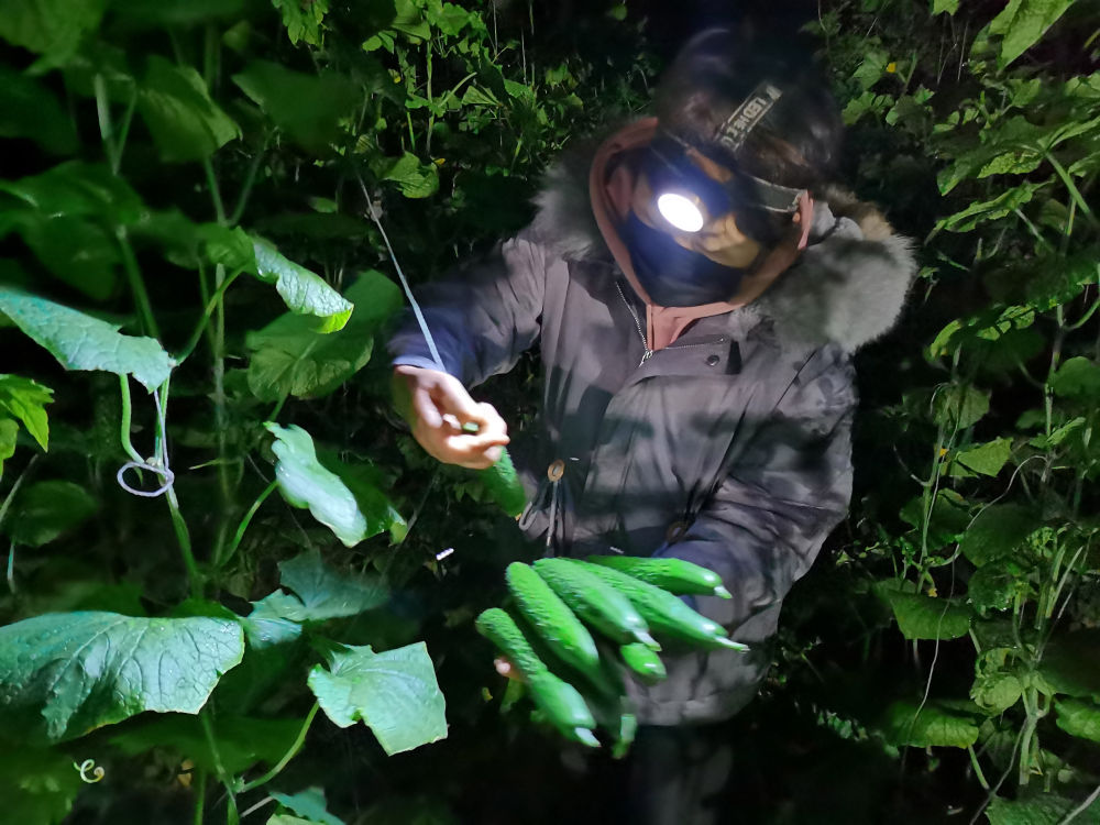 1月28日,山东省寿光市的蔬菜种植户凌晨1点多在大棚里采摘蔬菜。新华社发