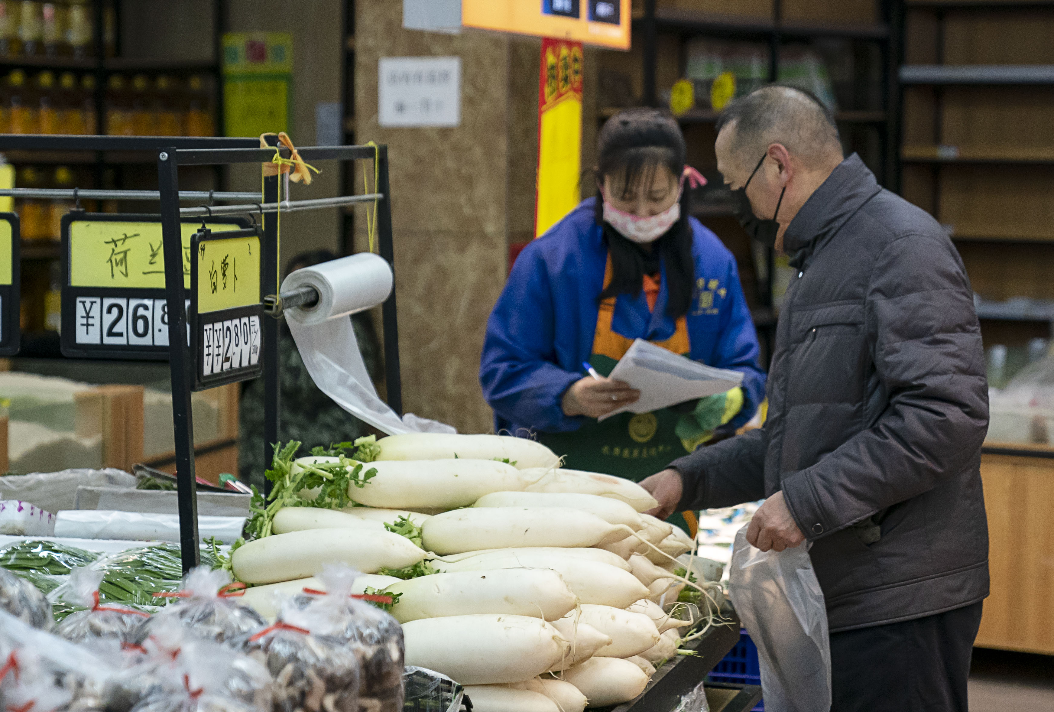 在四川成都青羊区同诚路的一家益民超市,货架上油菜、白菜等蔬菜品类很多,来买菜的附近居民不少。一旦货架上有哪种蔬菜快拿完了,售货员很快就重新补上。